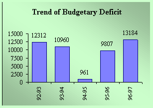 During 96-97, Net additions to 91 days treasury bills were Rs.12728 crores and Cash balance decreased by Rs.456 crores. Together, the Budgetary Deficit was Rs.13184 crores – an increase of Rs.3377 crores over 95-96. Budgetary Deficit for 96-97 is 1.03% of GDP against 0.89% for 95-96. |