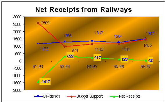 Railways paid a Dividend of Rs.1507 crores to General Revenues of the Government during the year 1996-97. From the General Revenues, a budgetary support of Rs.1465 crores was also extended to Railways to meet a part of their capital expenditure during 1996-97 resulting in net revenue of Rs.42 crores from the Railways. |